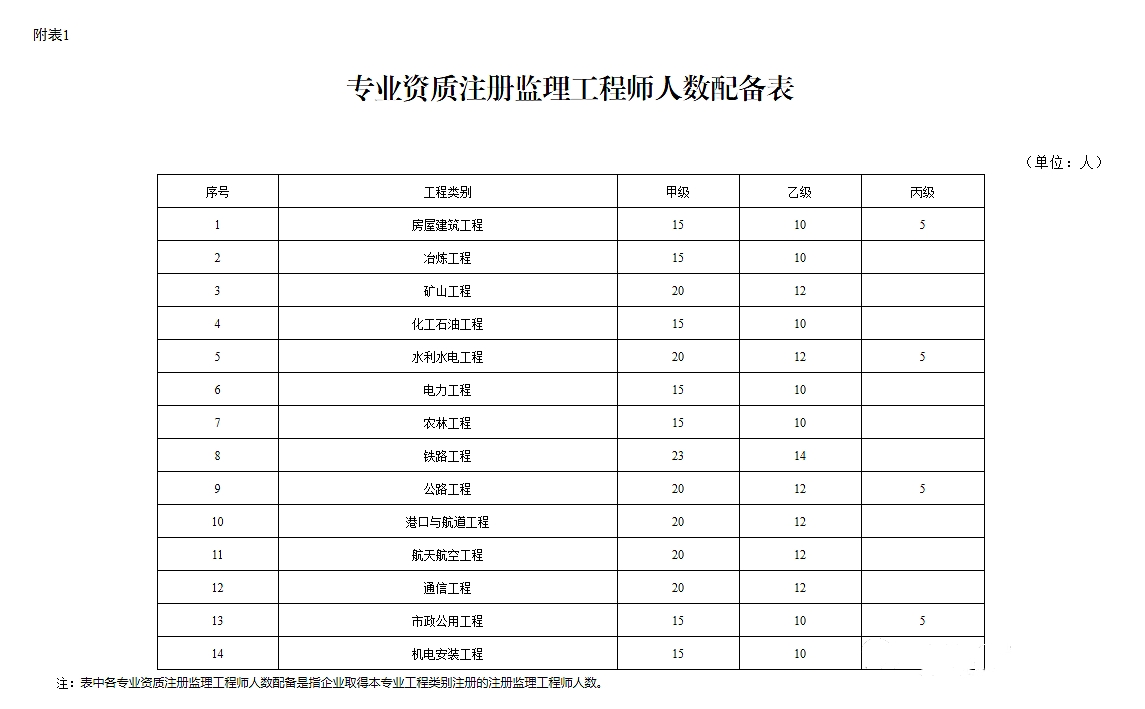 (3)相應專業的注冊監理工程師不少于《專業資質注冊監理工程師人數配備表》(附表1)中要求配備的人數。
