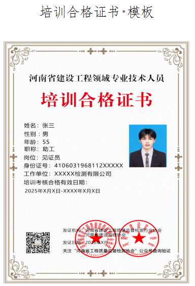 完成全部培訓課程并通過考核的人員,河南省建設工程質量監督檢測行業協會、河南省建設監理協會聯合發放見證員、送樣員、取樣員培訓合格電子證書,該證書可作為從業人員上崗和執業的資格證明。、
